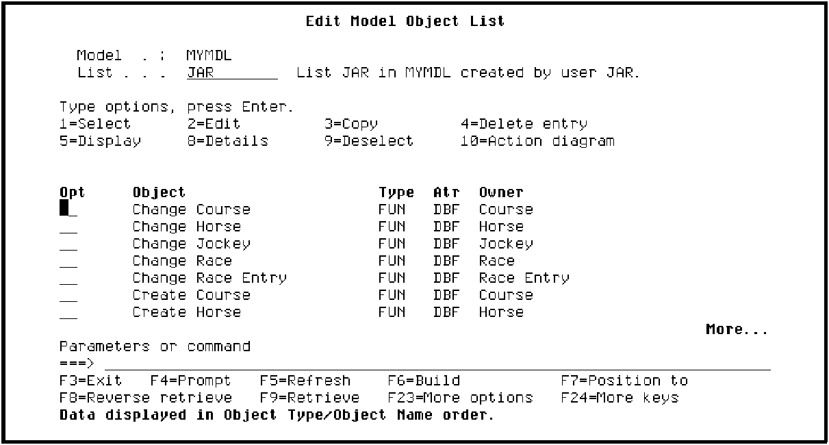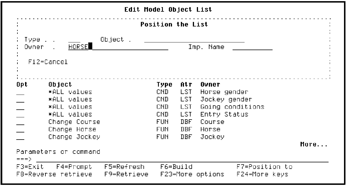 Note that the list is now positioned at the first model object that has HORSE as its owner. Note the message at the bottom of the panel. The following model objects are displayed alphabetically by Owner, and for each Owner, alphabetically by Object Type, and then by Object Name. Scroll through the list to verify this.