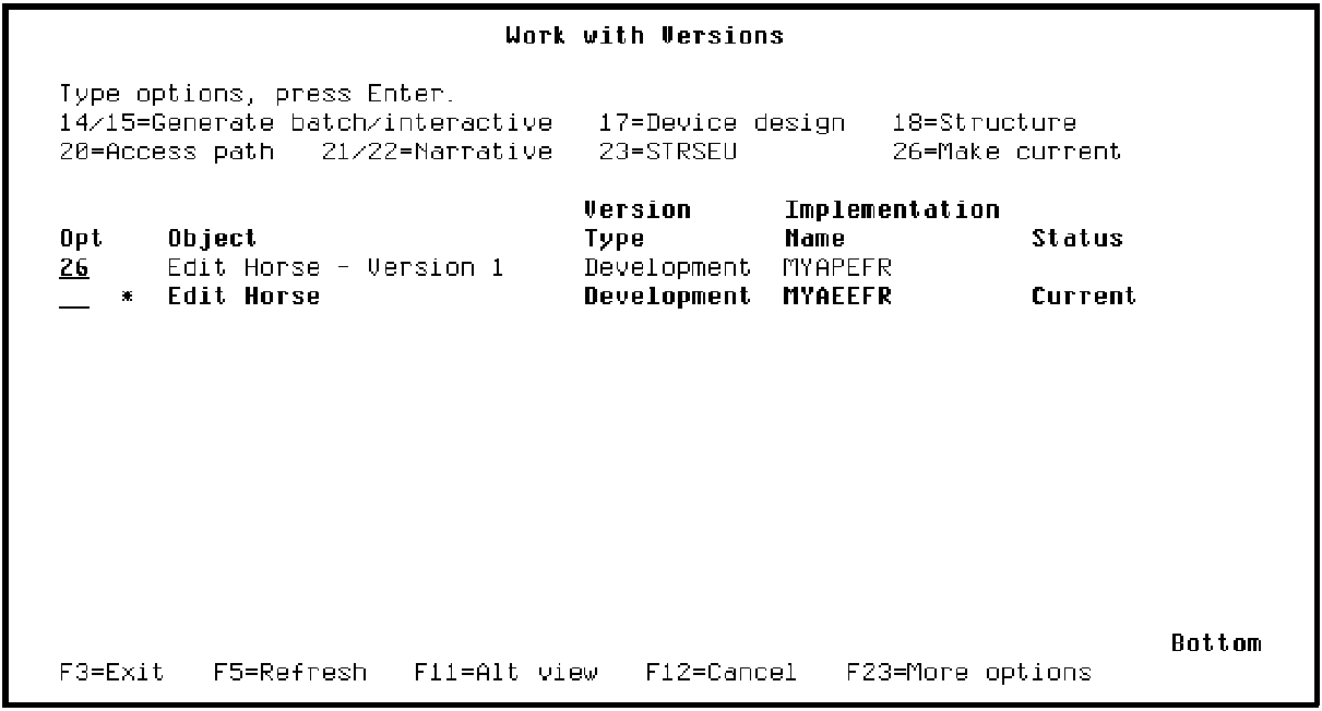 On the Work with Version panel, press F23 to view additional options. The appropriate option is 26, Make current. Type 26 in the Subfile selector for Edit Horse - Version 1.