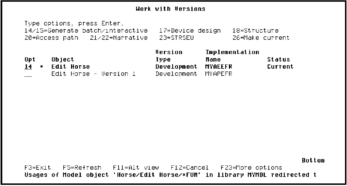 Press Enter to submit the request. Press F3 to return to the Edit Model Object List panel. The 0 to the right of the Subfile selector of the Edit Horse list entry indicates that it is a non-current version.