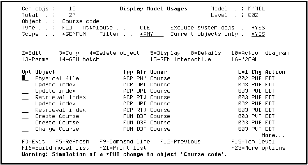 Press Enter to display all objects that will be affected by a *PUBLIC change to Course code.