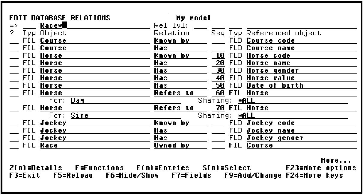 Return to the Edit Database Relations panel for your design model. Select the RACE and RACE ENTRY files by typing Race* on the selection line.