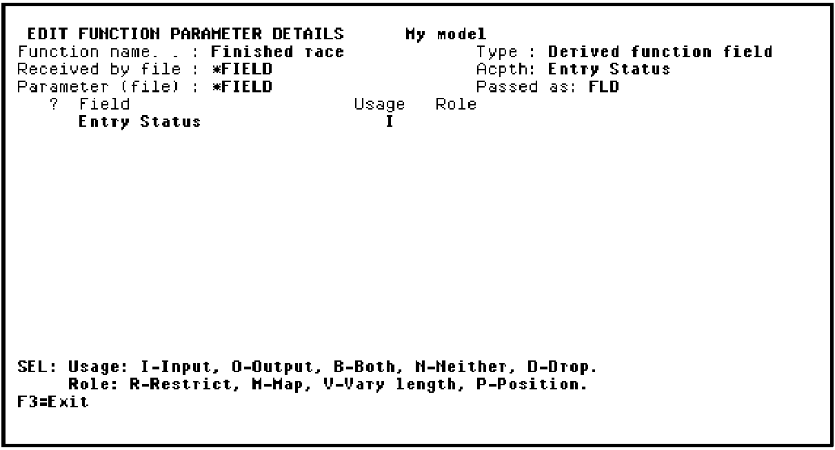 The derived (DRV) function field itself, Finished race, is automatically defined as an output parameter. Check this by displaying the parameter details. Type Z against the Finished race field to display the Edit Function Parameter Details panel. Note that the Usage for this parameter is O (output).