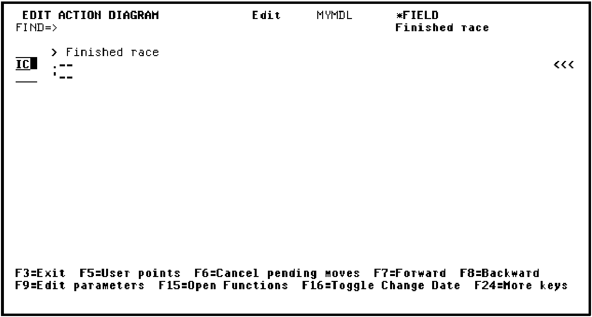 The action diagram for the function field Finished race will be displayed. Note that you are now editing the Finished race function as shown in the upper right corner of the panel. You will use the Action Diagram Editor to insert the following conditions and actions for the Finished race function field.