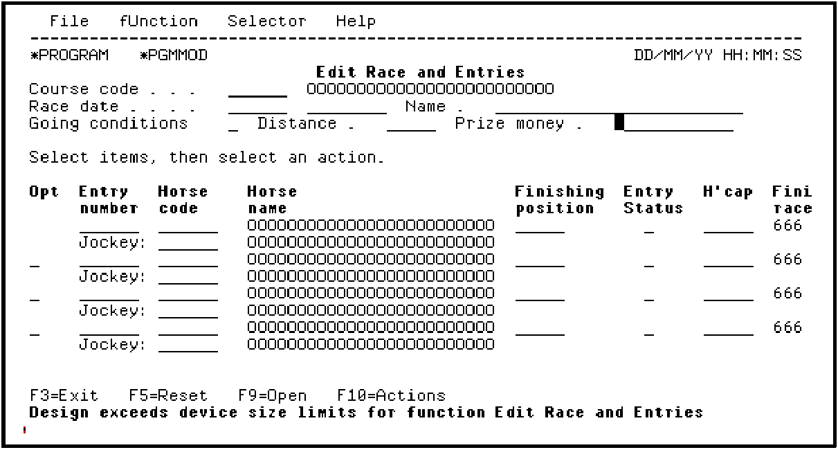Add the second function field to the header format (subfile control). Position the cursor on the field before the desired location for the function field, in this case Prize money, and press F19.