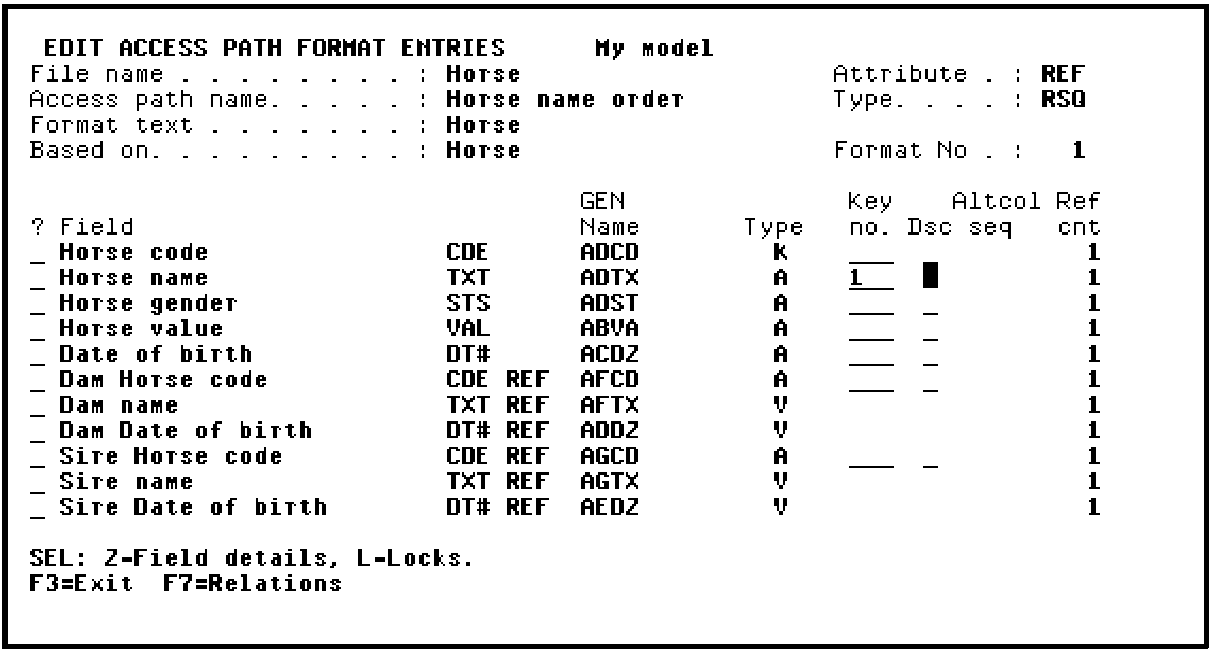 Specify an alternative key order. For this type of access path, you can choose any field except a virtual field as a key field. Use Horse name as the key.