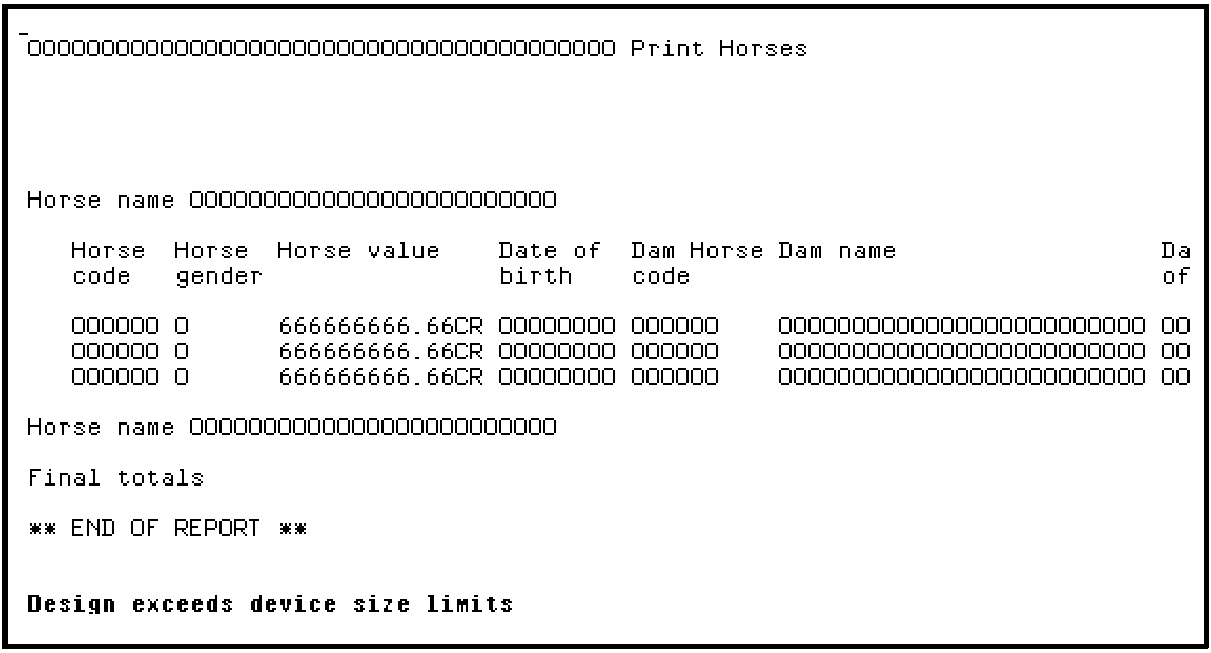 The detail format contains the subfile records from the based-on access path. It is shown on the Print Horses report layout between the Horse name heading and Horse name total formats. All the fields from the access path are available in this format. The key field (Horse name) is hidden by default because it already appears on the heading format.