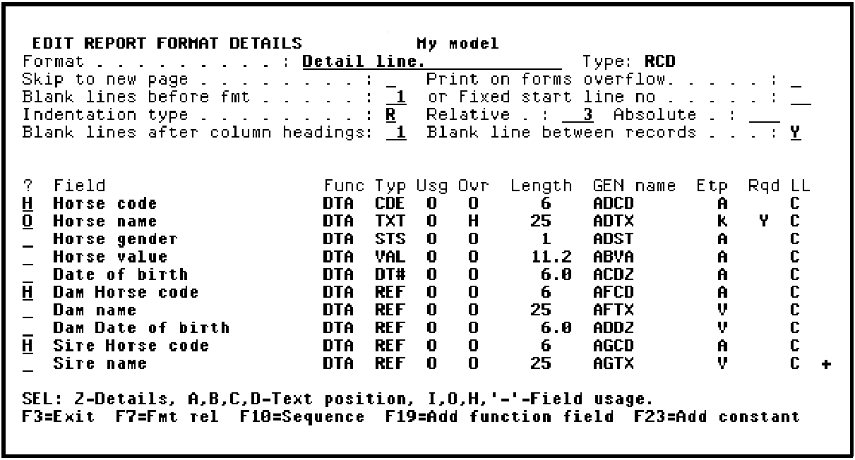 In this step, to make the report easier to read, you will specify a blank line between records and hide the Horse code, Dam code, and Sire code fields. In addition, you will change the Horse name field from hidden to output. By default, the Horse name field is hidden because it was originally present on the Horse name header format. Since the Horse name header format has been dropped, it now makes sense to have the Horse name appear on the Detail line format.
