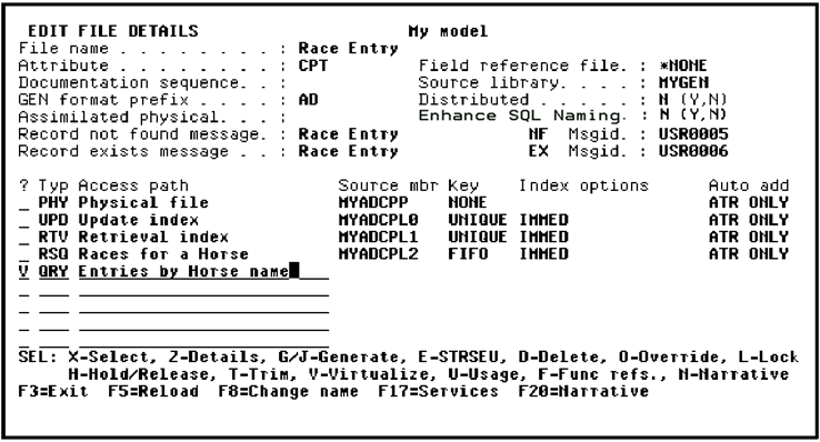 Press Enter to view the virtual entries that are available for inclusion on the access path; namely, Horse name and Jockey name.
