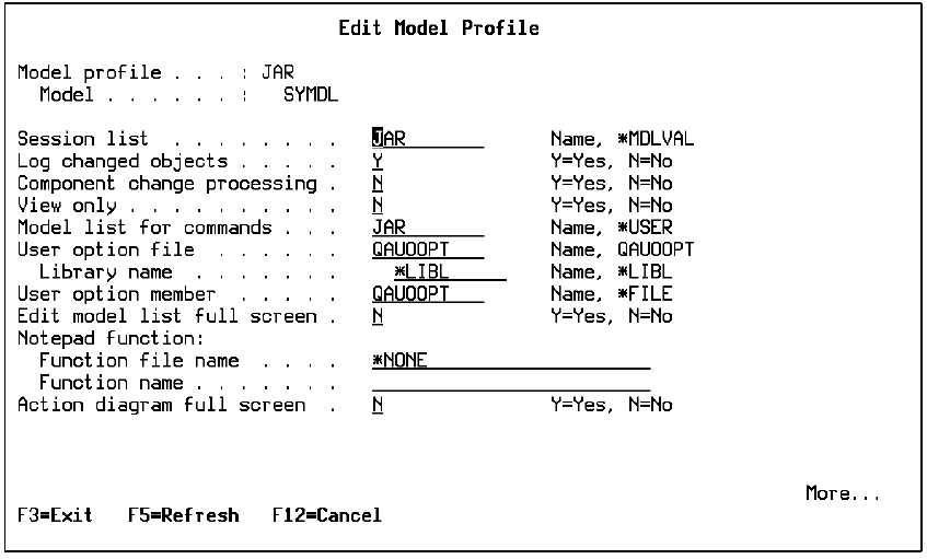 These values establish the default generation and creation environment for the current session and are used to preload job list commands; for example, the Submit Model Create (YSBMMDLCRT) command. In addition to changing values on this screen, you can modify the default values when you invoke the command by specifying other parameter values on the interactive command prompt or on the batch command.