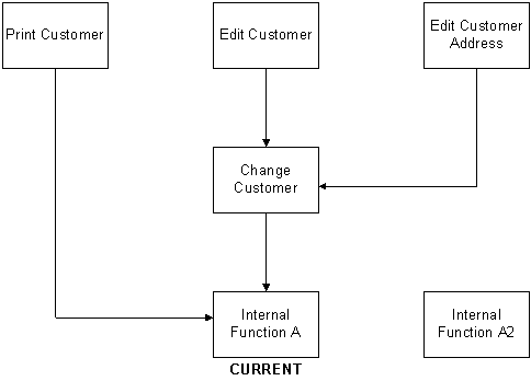 Suppose Internal Function A2, a version of Internal Function A, has been edited and tested and you want to make it current. This diagram shows the other objects in the model that see Internal Function A. Note that no model objects see Internal Function A2.
