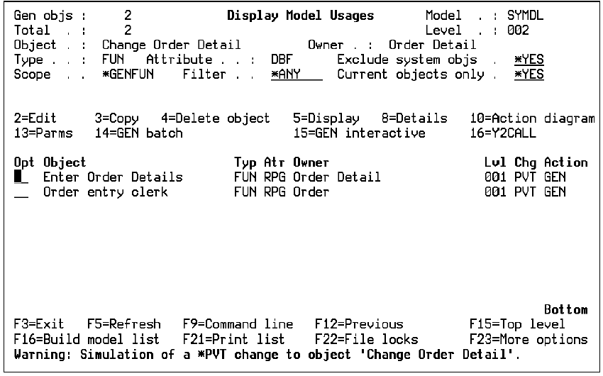 Note: The entries of a model object list always reflect the current state of model objects at the time the list is created unless you refresh them. As a result, the Action required field for entries of the new list will reflect the results of a previous run of component change processing and not the results of the simulation. To get a permanent record of the simulation, press F21 to print the results.