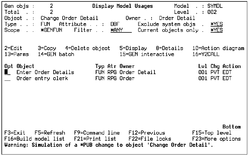 To simulate a public change, enter option 95 for the object you want to change on either the Display Model Usages panel or the Display Model References panel.