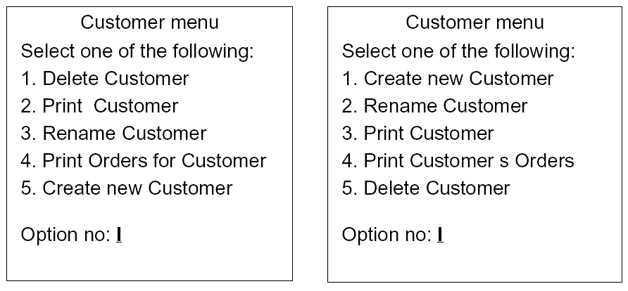 On task menus, options should be placed on menus in the order in which they are likely to be used. In particular, place options to manipulate an entity in a sequence that follows the life cycle of the entity. For example, of the following two possible arrangements, the second is better than the first: