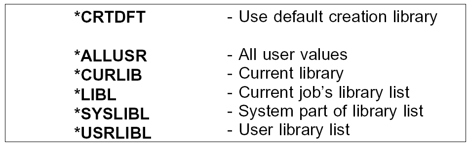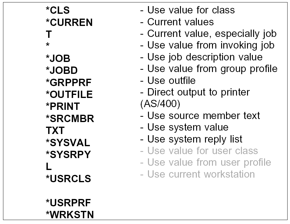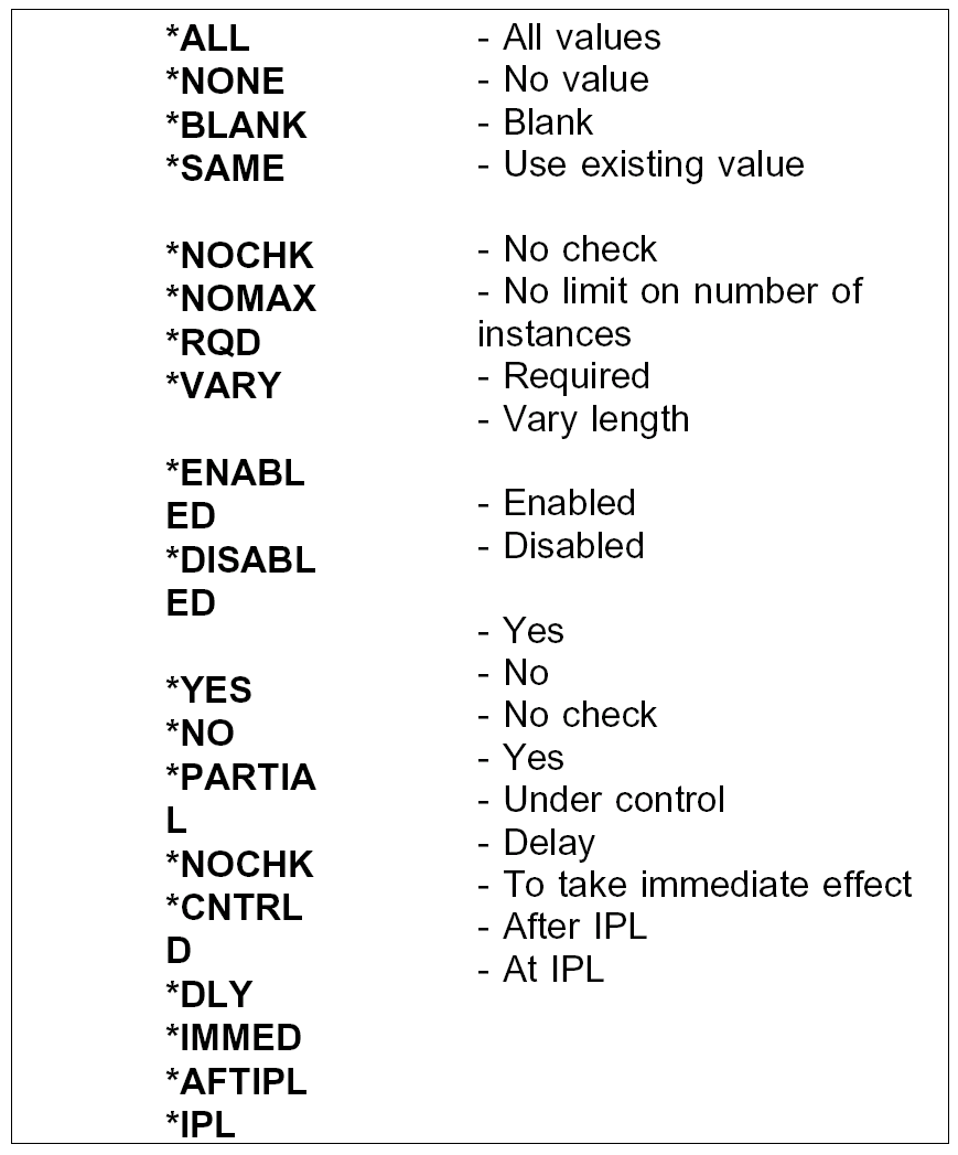 Special values for command parameters should always begin with an asterisk, for instance *ALL, *LIST, *NONE, *YES, *NO. A special value indicates a function or default action. Explicit values should not begin with an asterisk, for instance the default name of a file that is to be used, such as QTXTSRC.