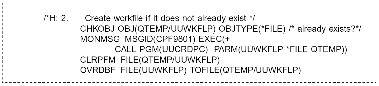 The following code would create a work file UUWKFLP in QTEMP from a model library, by calling a program UUCRDPC, which in turn, calls a program UULBNMR.