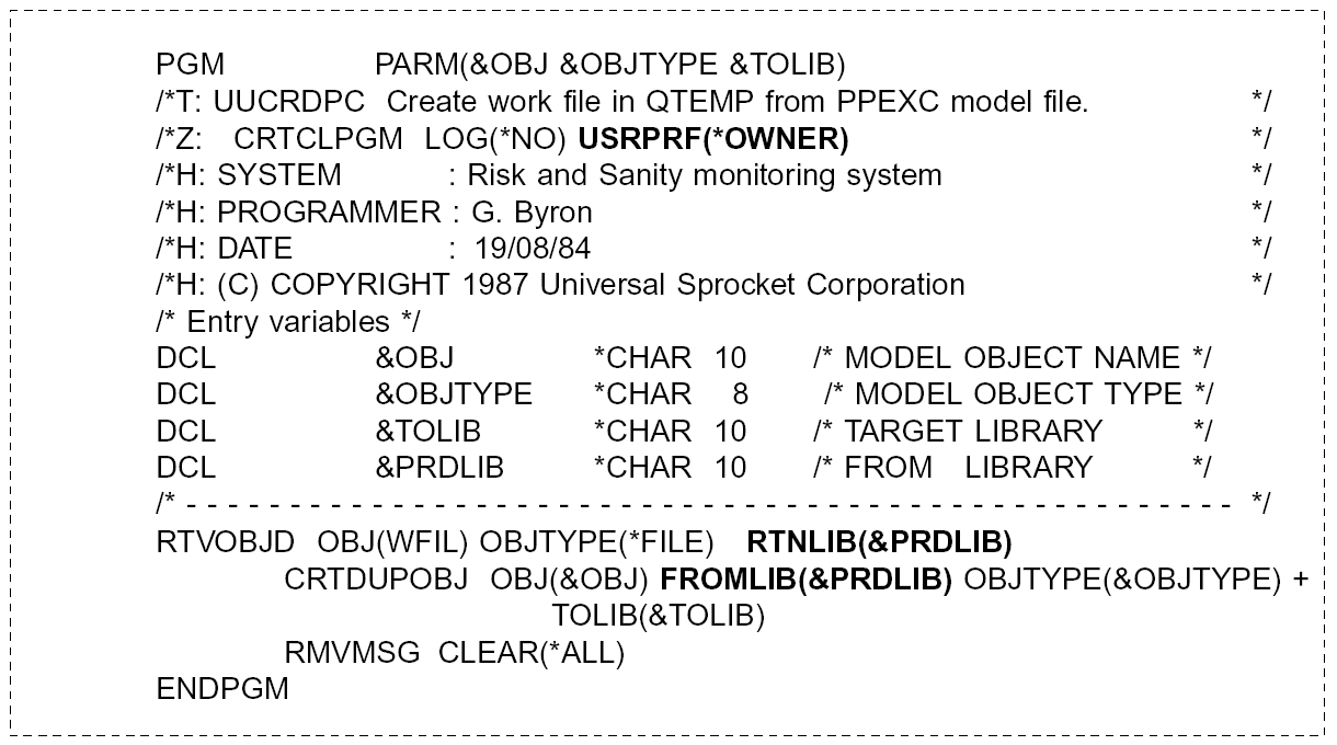 Work objects should be duplicated into QTEMP by use of the OS/400 Create Duplicate Object (CRTDUPOBJ) command, working on a model object kept in the system execution object library. Note that the CRTDUPOBJ command requires that the name of the library containing the model object be specified—the name of the originating library should not be ‘hard coded’ as a literal, but retrieved, as above.