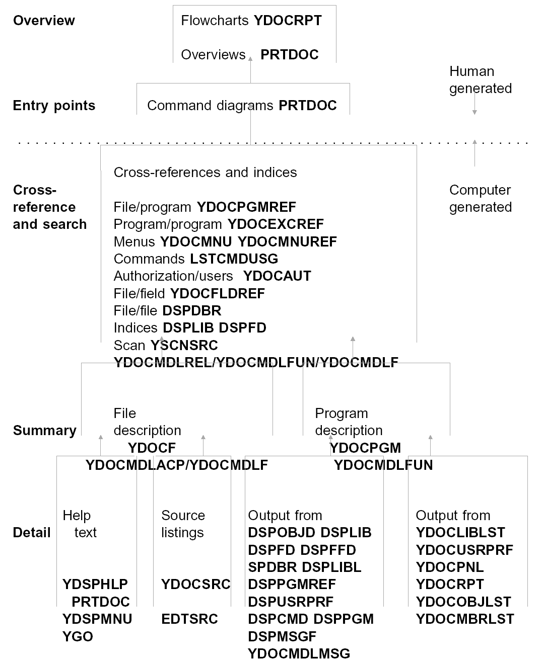 - Command Based Documentation—A number of reasons were given earlier in this manual for arranging system design around user-defined CL commands, each command being the entry point to an application function. Not least among the reasons given was that CL commands provide a natural framework for arranging the operational documentation for the application, as well as a notation for doing so. The framework has a flat structure that enables the user to look up the operational details for invoking any task directly without having to locate it through a menu hierarchy.