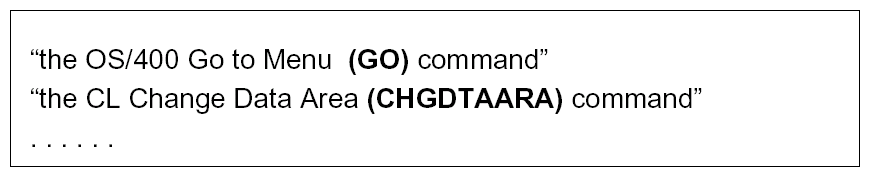 Give references to commands, both OS/400 and user-defined, in the following format: