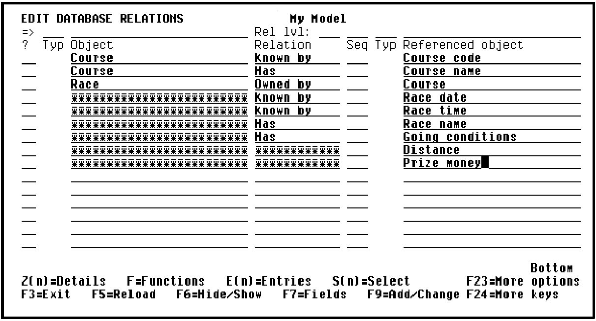 Type in relations as shown and use the Tab key or the Field Exit key to advance to the next field or line.
