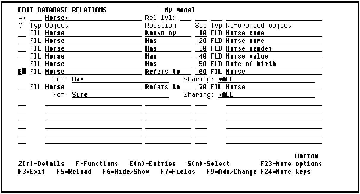 The entries on the HORSE file are automatically updated by CA 2E to include the two new Refers to relations. Examine the entries on the HORSE file by typing E in the Subfile selector.