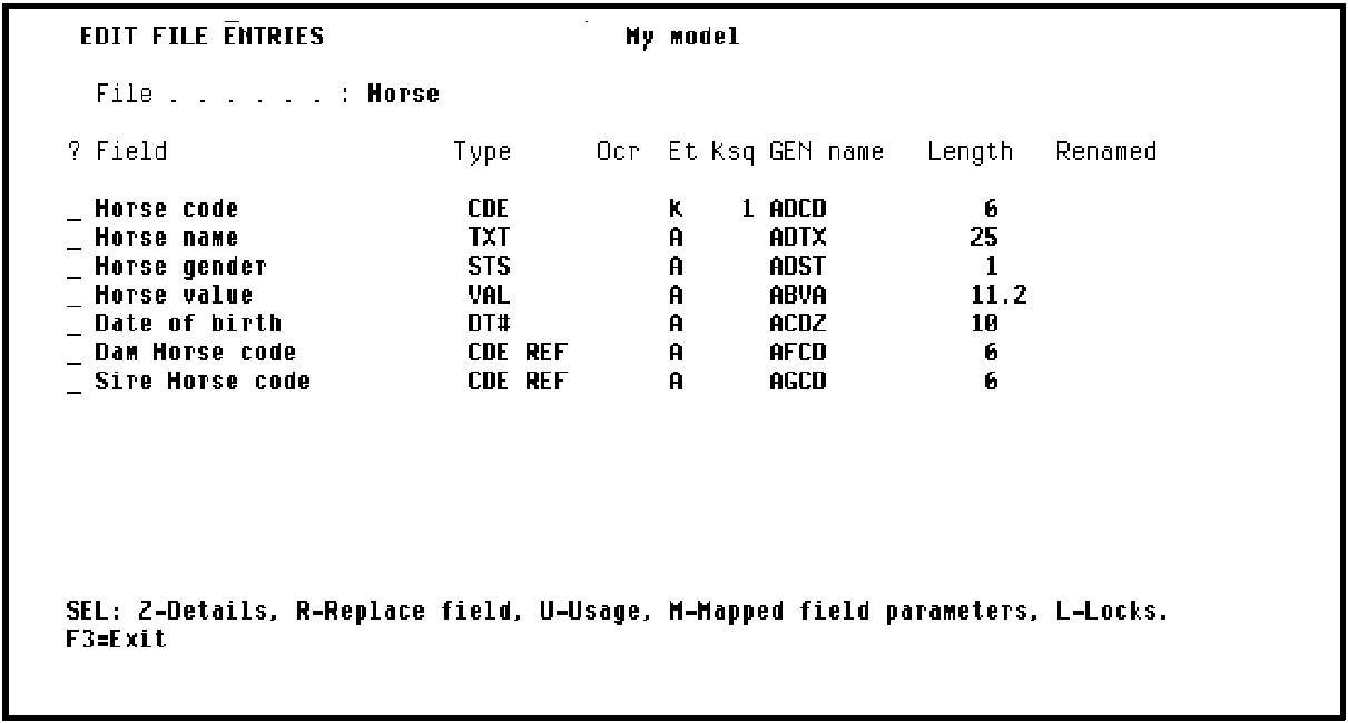 Note that the resolution of the two Refers to relations added two foreign key entries to the HORSE file, Dam Horse code and Sire Horse code.CA 2E based the definition of these fields on that of the Horse code field, and as a result, assigned the attribute CDE. REF following the attribute indicates that the field entry was resolved from a Refers to relation.