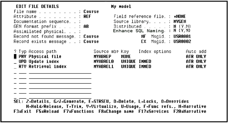 The access paths for a file are recorded on the Edit File Details panel. To obtain this panel for the COURSE file, you will zoom against one of the relations for the file on the Edit Database Relations panel. Type Z against one of the relations for the COURSE file.