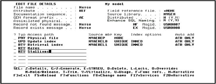 For example, you can define an access path to select only certain relations from the file or to include selection criteria based on conditions specified for certain fields. In this tutorial, you will specify new access paths that select only mares or only stallions from the HORSE file. Call these new RTV access paths Mares and Stallions.