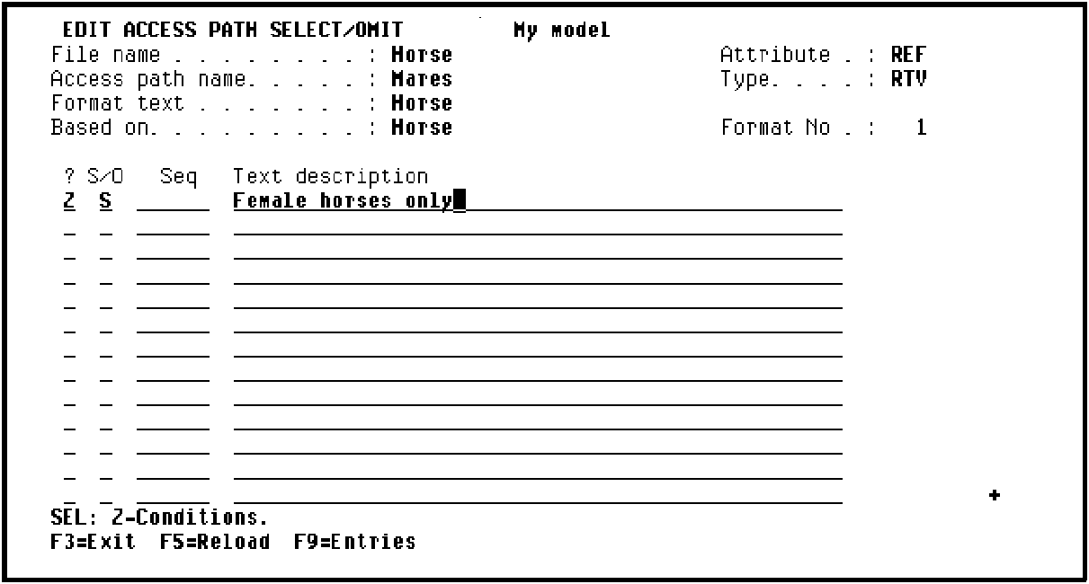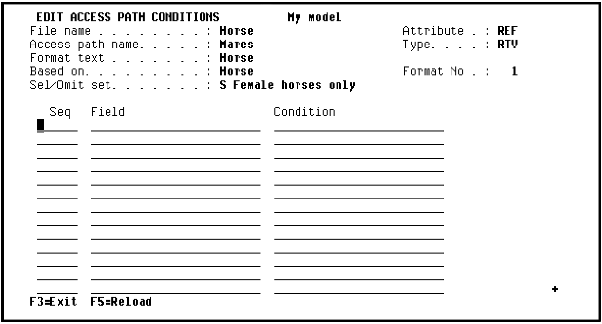 Press Enter to display the Edit Access Path Conditions panel. Note the Select/Omit set field.