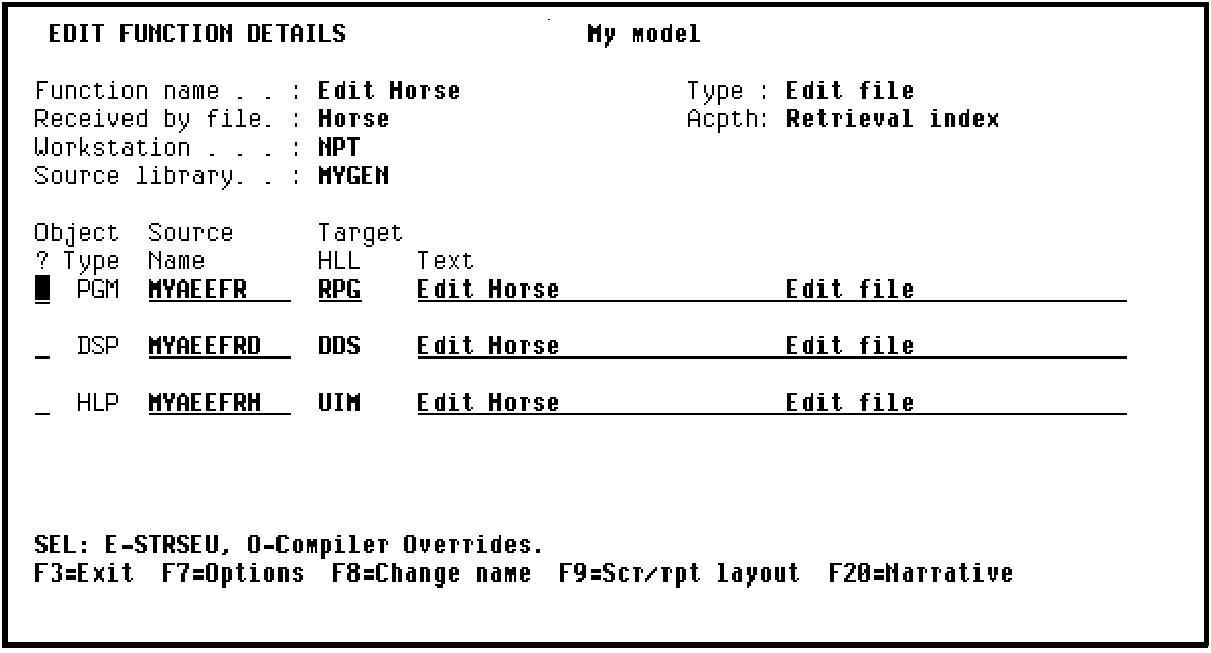 Press Enter to view function details for the Edit Horse function. Note the program (RPG), display file (DDS), and the help text file (UIM).