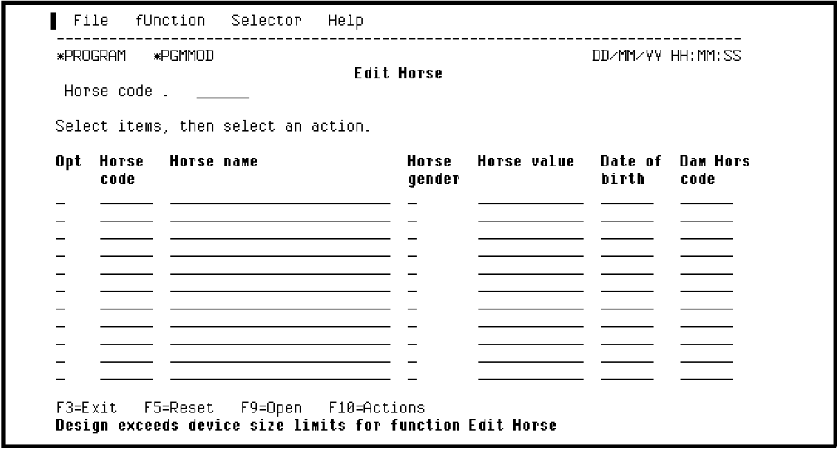 By default, only 80 characters of the panel design may be displayed at one time. You can move the panel window to display more of the panel design by pressing F4, which moves the window 40 columns to the right. Pressing F4 again moves the subfile record another 40 columns to the right. Pressing F1 moves the panel design 40 columns to the left.