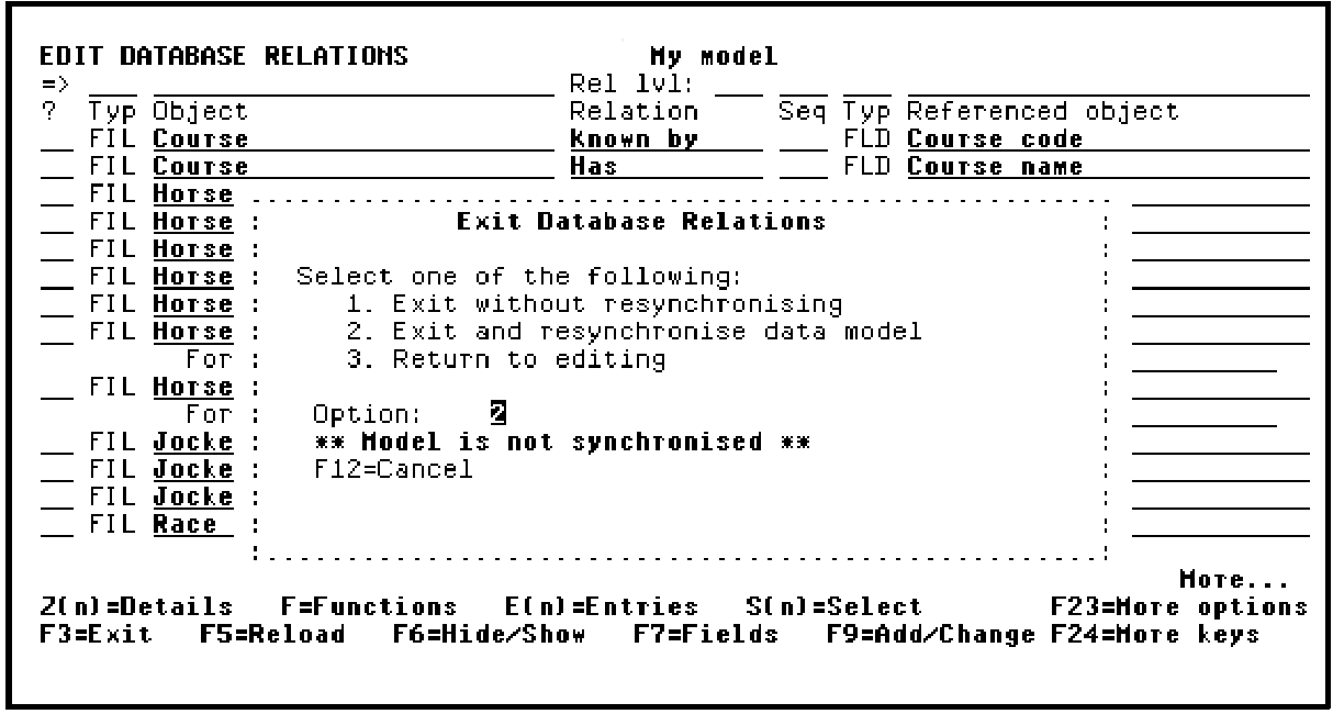 Note: If you have previously exited your design model, your model may already be resynchronized. In this case, the Exit Edit Relations panel defaults to Exit without re-synchronizing.