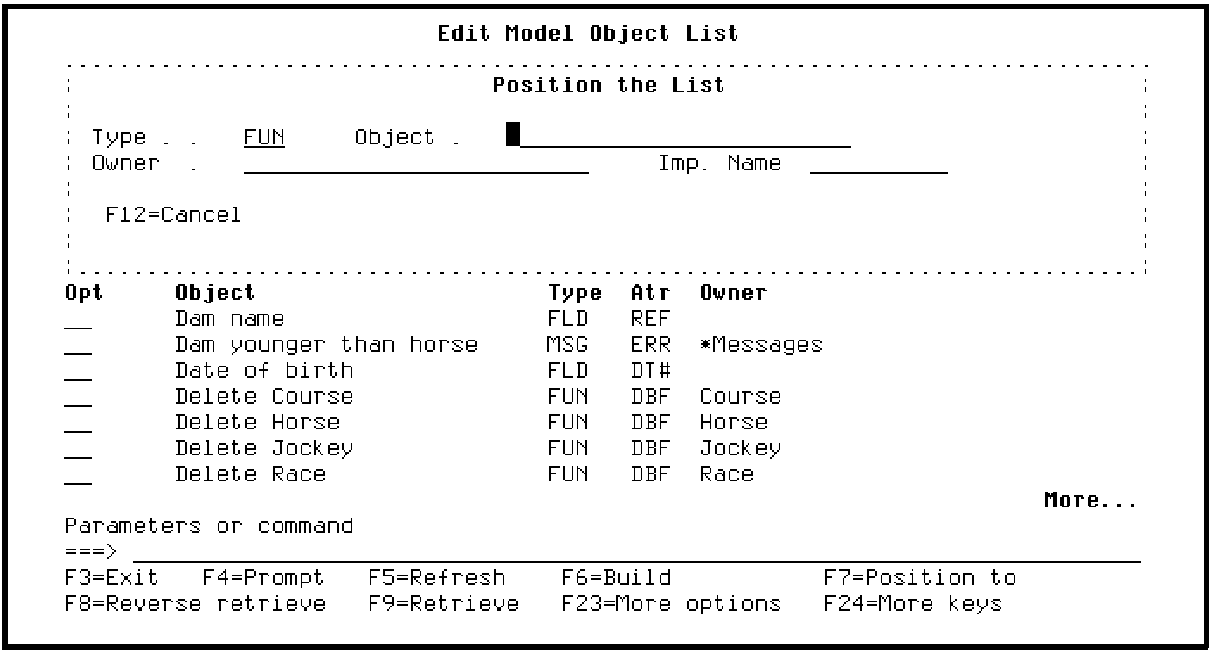 Note that the list is now positioned at the first model object of type FUN. The following model objects are displayed alphabetically by type, and for each type, alphabetically by object name. Note the message displayed at the bottom of the panel indicating this.