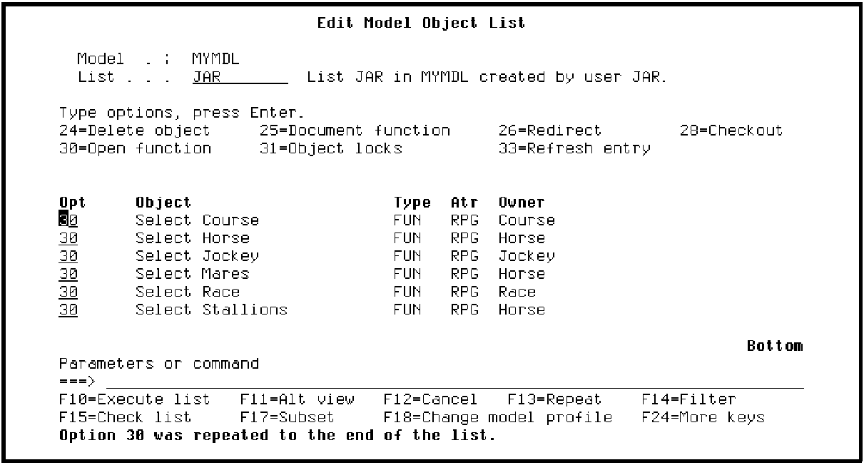 Suppose you want to work with each of the Select Record functions on your model list; for example, to edit their device designs or action diagrams. Press F23 three times to view additional Subfile selector options. Option 30 lets you open several functions at once.