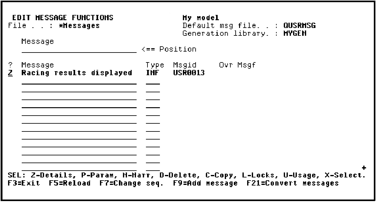 Type Z in the Subfile selector for the Racing results displayed message function.