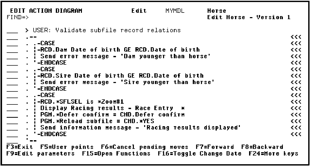 In this case, the defaults are correct; namely, Horse name is an input (I) parameter and the source of its value is the RCD (Subfile record) context. Press Enter to accept the defaults and return to the Action Diagram Editor.
