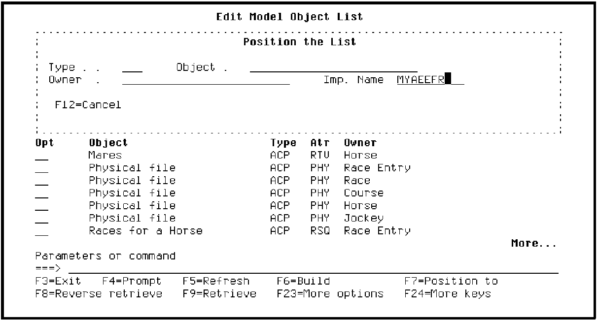 The *ALLOBJ list is now positioned at the Edit Horse function. Note the message at the bottom of the panel and that the alternate view showing the Implementation name displays automatically. You can change views by pressing F11.