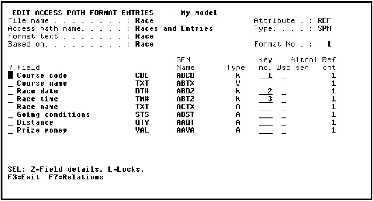 The next step is to check the keys of the Race access path format. You may specify any of the fields from the RACE file as keys, in either ascending or descending order. However, there must be a common key between the two formats. For example, the header record key fields must be part of the detail record’s key.