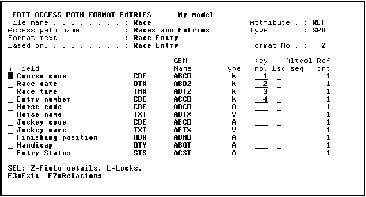 In this step you will zoom into the Race Entry access path format to check its key.