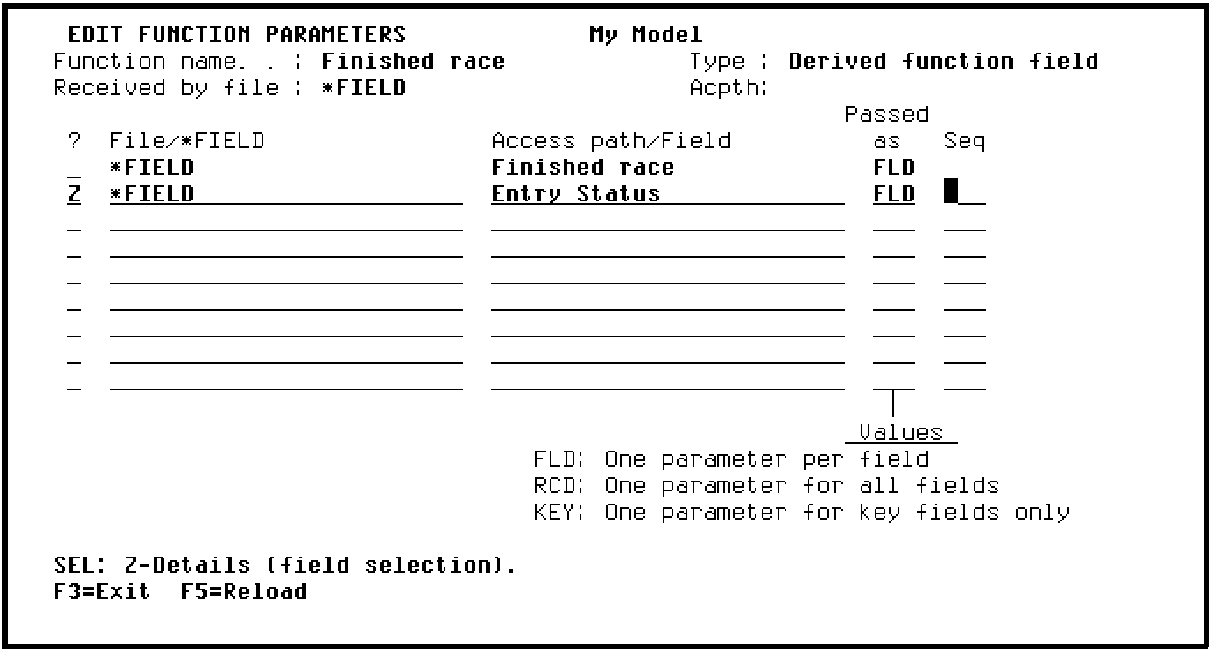 The derived (DRV) function field itself, Finished race, is automatically defined as an output parameter. Check this by displaying the parameter details. Type Z against the Finished race field to display the Edit Function Parameter Details panel. Note that the Usage for this parameter is O (output).