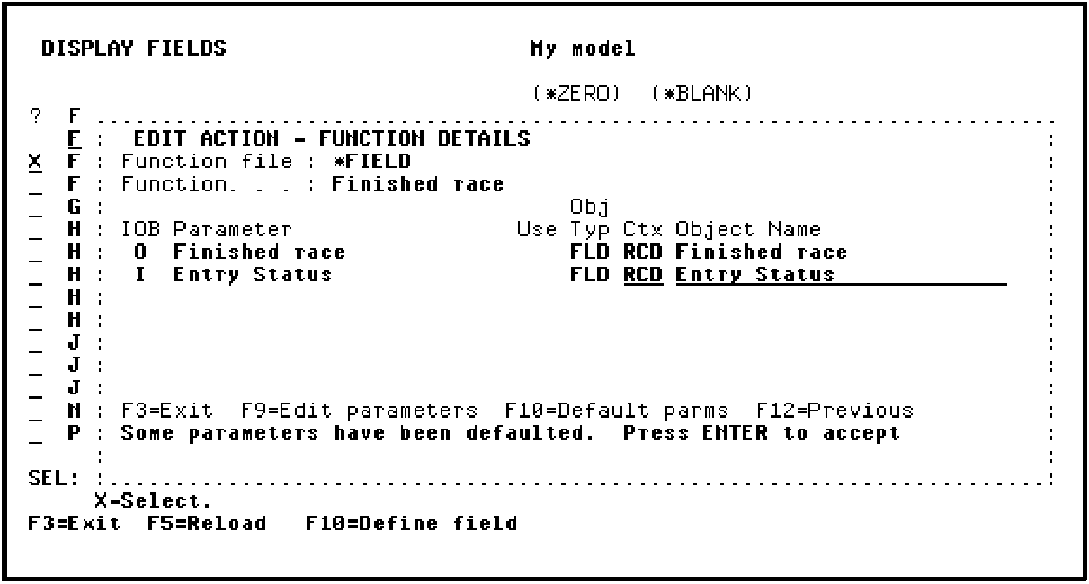 The Edit Action - Function Details window is displayed showing the parameters for the Finished race function field. Note that the input parameter is Entry Status, the output parameter is Finished race, and both parameters have the RCD (subfile record) context.