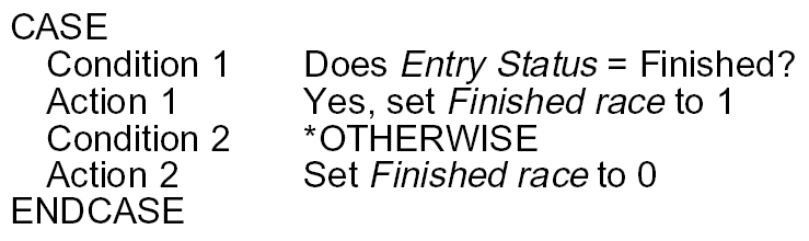 The action diagram for the function field Finished race will be displayed. Note that you are now editing the Finished race function as shown in the upper right corner of the panel. You will use the Action Diagram Editor to insert the following conditions and actions for the Finished race function field.
