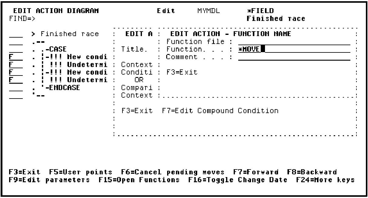 You have just finished defining the first condition in the CASE construct you are defining. Because you also typed F against the first action in the CASE construct, CA 2E displays the Edit Action - Function Name window to specify the action. In this case, the action will be the built-in function *MOVE.
