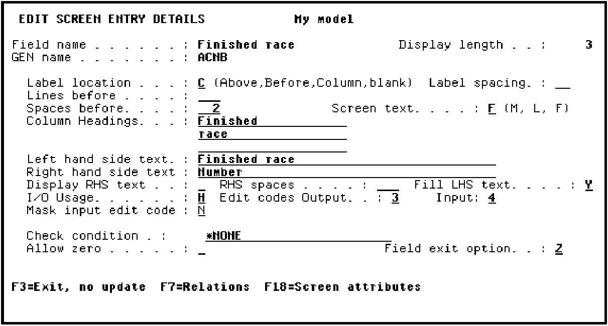 To do the latter, position the cursor on the field and press Enter. The Edit Screen Entry Details panel displays. Change the I/O usage for the field to hidden (H).