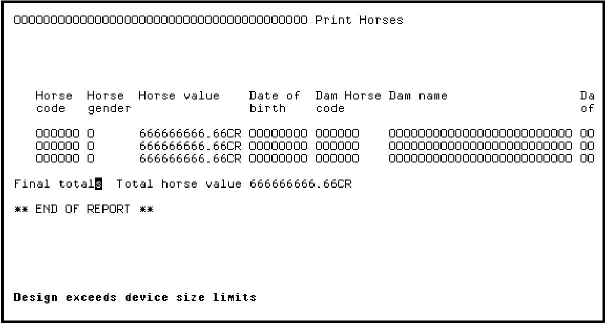 The Total horse value function field is now present on the Final totals format. To add the other function field, position the cursor on the Final totals format.