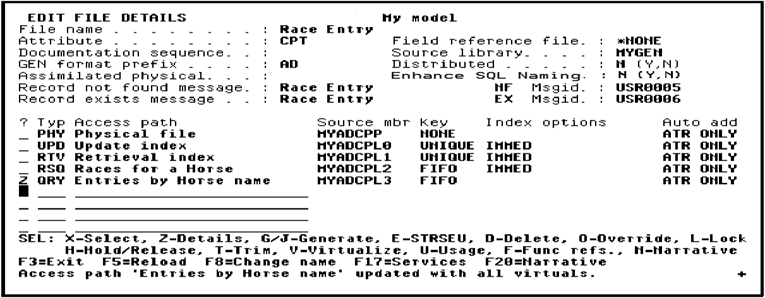 Press Enter twice to validate and confirm the inclusion of the two virtual entries and return to the Edit File Details panel. Note the message at the bottom of the panel indicating that the access path has been updated with all virtuals.