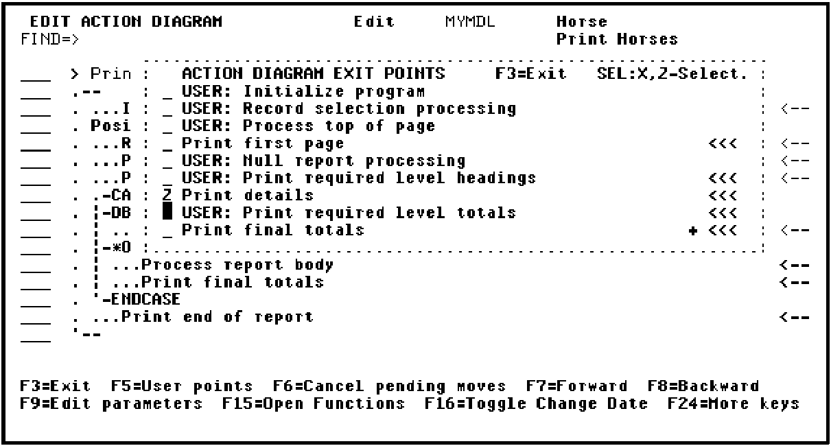In this example, you will use the second method. Go to the Action Diagram Editor for the Print Horses function. To do so, type F next to the Print Horses function on the Edit Functions panel.