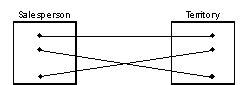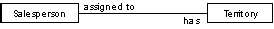 The relationship between the two entities Salesperson and Territory is a one-to-one relationship because each salesperson is assigned to one territory and each territory has one, and only one, salesperson assigned to it.
