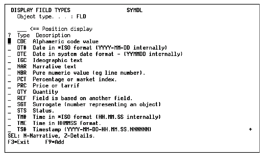 Type Z against one of the relations for the *Field attribute types file to access the field types. The Display Field Types panel displays.