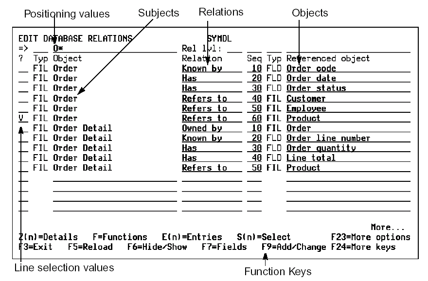 - Function keys to define objects (F10), access online Help (Help key), the Data Dictionary (F7),CA 2E online map (F14) or CA 2E Display Services Menu (F17).