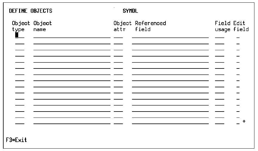 The Define Objects panel displays. This panel allows you to create objects. You can define more than one object on the subfile panel for a single Enter key.